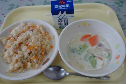 給食です 公開日 2020/12/09 更新日 2020/12/09 校長室 今日の献立は、ガーリックピラフ、白菜のクリーム煮、牛乳です。5年生の男子が今日のピラフのおいしさに感動していました。 いいね(0)