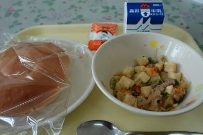 今日の献立は、うず牛乳ですまきパン、豆腐のチャンプル、ミルクバター、牛乳です。