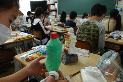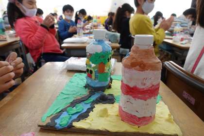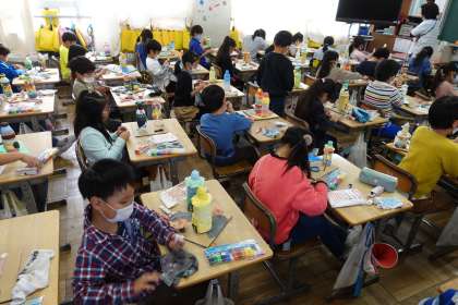 3年1組の図工を見学しました。作品は自分たちの「想像の町」を表現しているそうです。子どもたちの豊かな発想に驚きました。