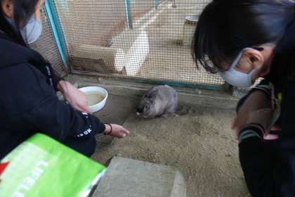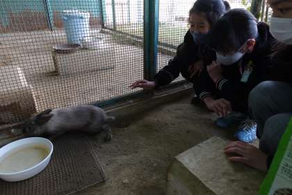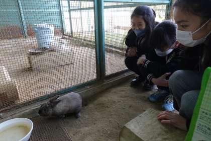 お昼休みに、飼育委員の3人が世話をしてくれていました。ふわりの頭を撫でたいのですが、ふわりは嫌がって触らせてくれません。