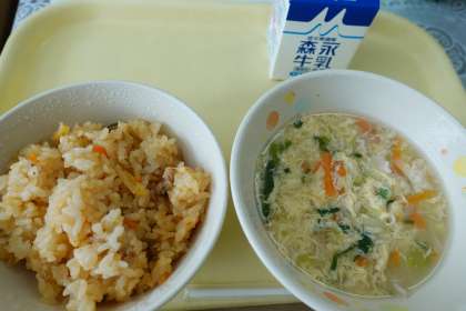 今日の献立は、豚キムチご飯、卵トック、牛乳です。