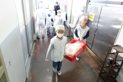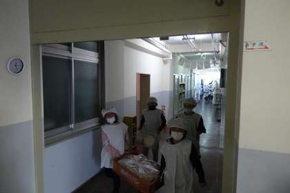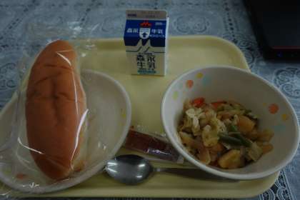 今日の献立はコッペパン、魚のオイスターソース、イチゴジャム、牛乳です。
