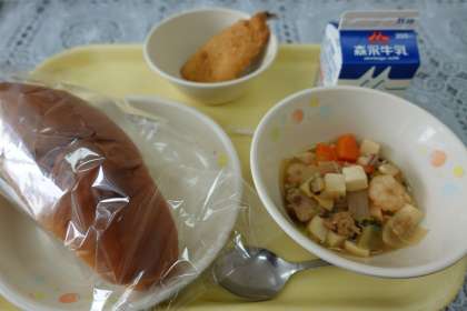 今日の献立は、豆腐のうま煮、アジ松葉フライ、黒糖パン、牛乳です。