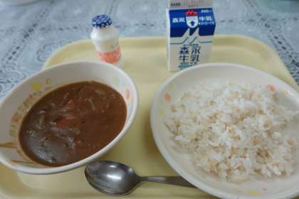 今日の献立は、カレーシチュー、玄米ご飯、ヨーク、牛乳です。今日は子どもたちに人気のメニューです。