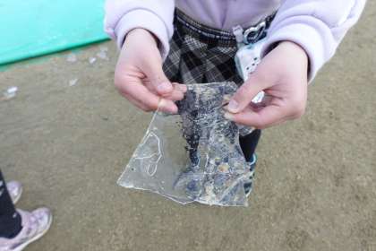 休み時間の様子です。シートに溜まっていた水が凍っていました。