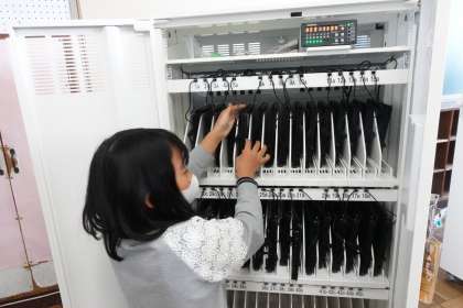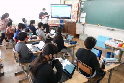 5年生の様子です。タブレット端末になれるため、少しずつ触り始めています。子どもたちに感想を聞くと「とてもワクワクする」、「早く家で使ってみたい」、「授業が楽しみ」だそうです。