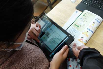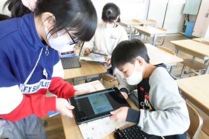 今日は基本的な使い方ばかりですが、子どもたちは目を輝かしながら触っています。写真は、QRコードを読み取って教材を探している様子です。