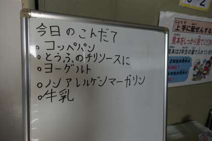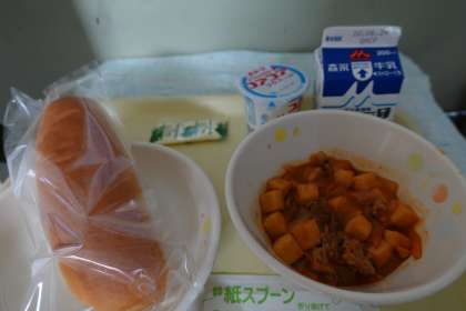 今日の献立はコッペパン、豆腐のチリソース煮、ノンアレルゲンマーガリン、ヨーグルト、牛乳です。