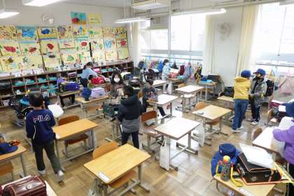 写真は朝の準備をする1年1組です。1年2組は更衣中でした。