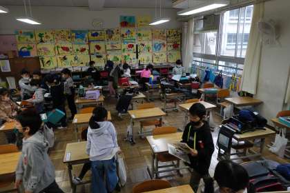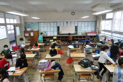 朝の準備をする1年生です。