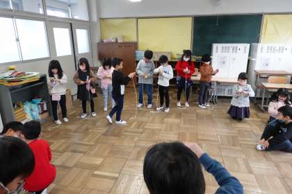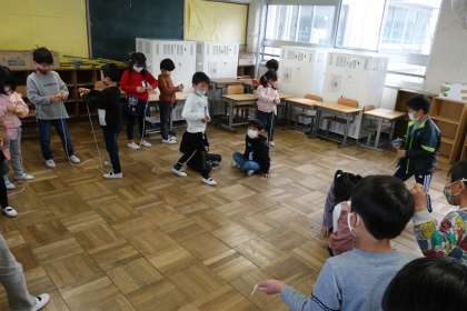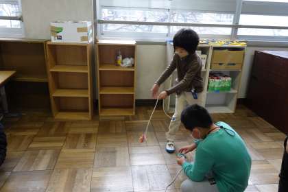 1年2組です。図工で作った凧を揚げに行ったのですが、途中で雨が降ってきて中止。コマ回しに変わりました。とても上手な人が何人もいて驚きました。
