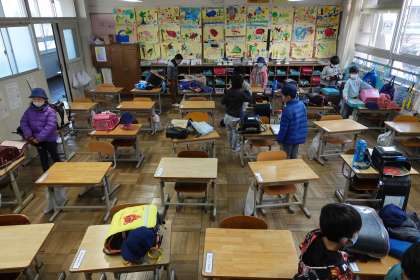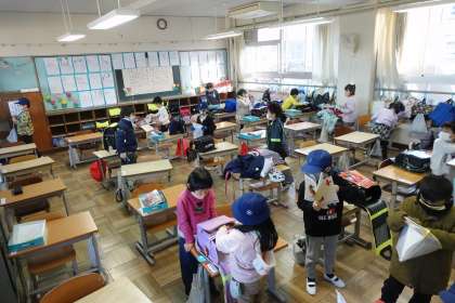 写真は朝の準備をする1年生です。