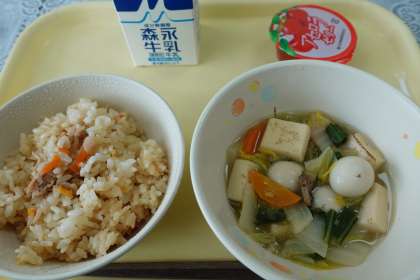 今日の献立は中華風かやくご飯、青菜のさっぱり炒め、アセロラゼリー、牛乳です。