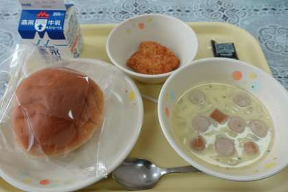 今日の献立は、バーガーパン、とんかつ、クリーミースープ、牛乳です。寒いので温かいスープがとてもおいしいです。