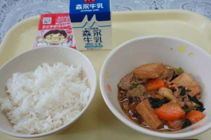 今日の献立は、ご飯、厚揚げの五目煮、ふりかけ、牛乳です。