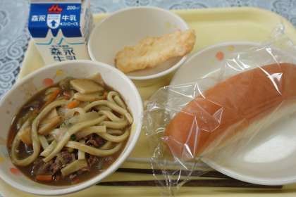 今日の献立は、カレーうどん、ベビーパン、イカの天ぷら、牛乳です。