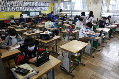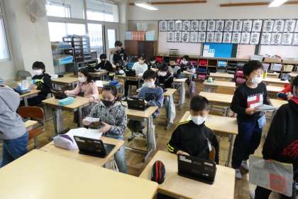 5年生の様子です。朝の様子が大きく変わりました。まずタブレットを取りに行くことから始まり、教室でその日の連絡事項や宿題を確認します。タブレットで課題を提出している児童もいます。