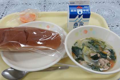 今日の献立は、黒糖パン、白菜と肉団子のスープ、ゆめオレンジ、牛乳です。