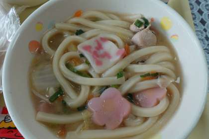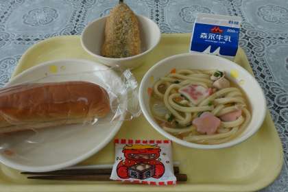 今日の献立は、黒糖ベビーパン、あんかけうどん、イワシフライ、福豆、牛乳です。うどんの上に、かわいい鬼さんを見つけました。