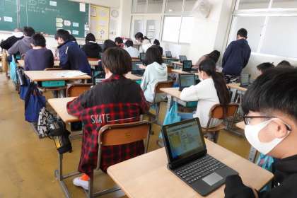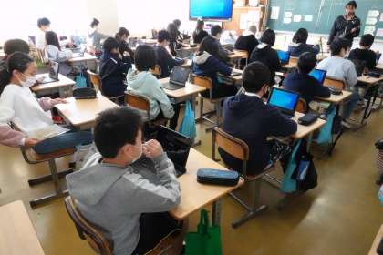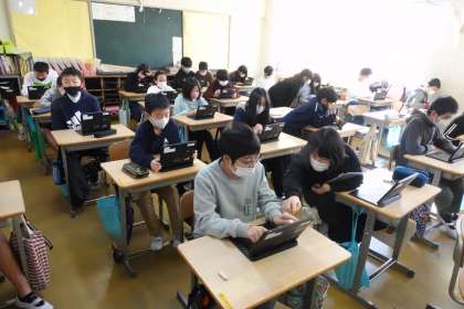 6年3組の理科です。タブレットを使って、「パソコンにどういう指示を与えれば、部屋の温度が最適かつ省電力になるか」(プログラミング学習)を考えています。かなり難問でしたが、子どもたちは次々と正解を出していました。