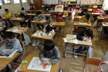 1年1組です。図工でお面づくりをしていました。