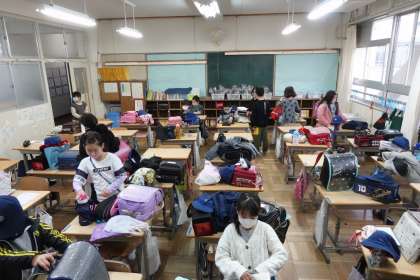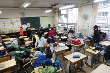 朝の準備をする3年生です。