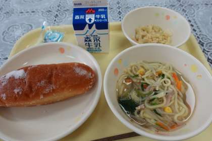 今日の献立は、ベビー揚げパン、大豆の花サラダ、コーンラーメン、和風ドレッシング、牛乳です。