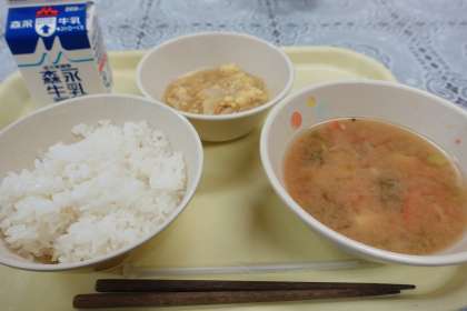 今日の献立は、ミスターたまご丼、ご飯、みそ汁、のり、牛乳です。