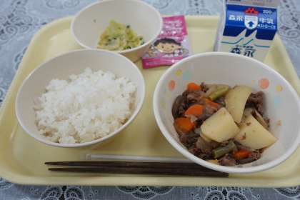 今日の献立は、肉じゃが、ご飯、胡麻和え、ふりかけ、牛乳です。