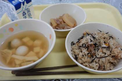 今日の献立は、ひじき大豆ご飯、五目汁、豚肉と大根の煮物、牛乳です。