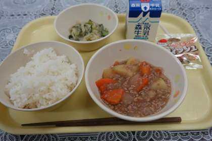 今日の献立は、ご飯、じゃがいものそぼろ煮、切り干し大根のお浸し、アーモンドミニフィッシュ、牛乳です。