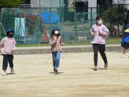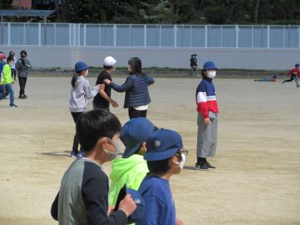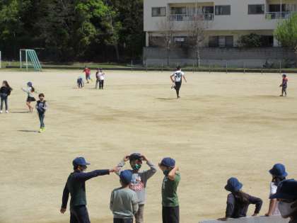 先生たちも一緒に遊んでいます!校長先生も運動場デビュー日をさぐっています・・。