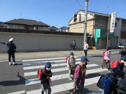 今朝は、登校時の安全について、警察の方、交通安全協会の方もご協力いただいています。