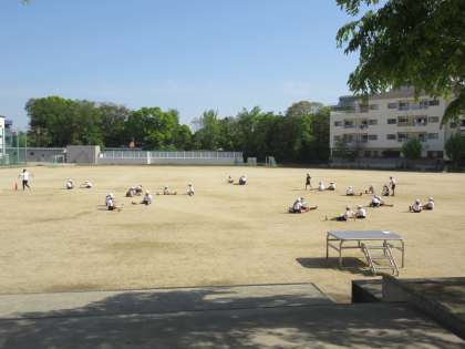 1時間目の体育です。最初にめあてを確認して、グループで広がってストレッチです。