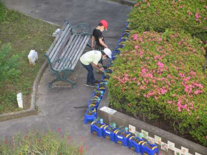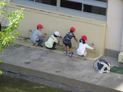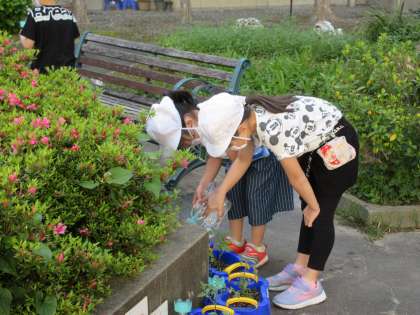 2年生は、登校するとすぐにミニトマトに水やりをしていました。