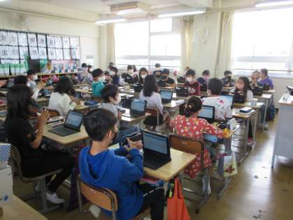 学習の最後の場面でしたが、6年生ではタブレット端末を使って、自分の考えを示す「ポジショニング」機能を全員で共有していました。
