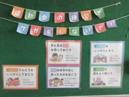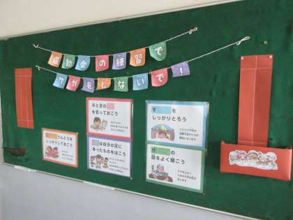 保健室前の掲示板が、運動会(体育参観)に向けてリニューアルされていました。