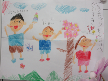 道徳で「お世話になっている人」という学習をしたそうです。難しく言いますと道徳科内容項目「感謝」の学習ですが、この1枚の絵を握りしめて校長室に持ってきてくれたこと・・、校長先生の方が「感謝」です。心がほっこりしました。1年間校長室に飾らせていただきます。