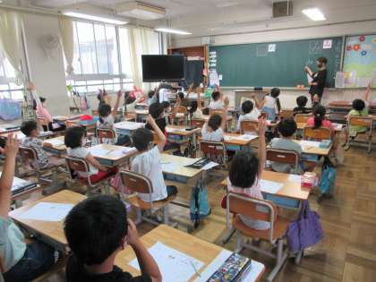 「み」と「ぬ」の学習です。よく見ると隣のクラスの先生が前にいます。このクラスの先生は隣で授業をしています。一人ひとりの子どもをできるだけ多くの教員で関わっていきます。