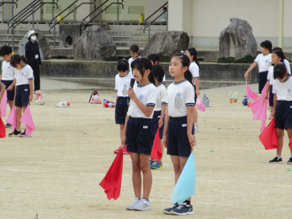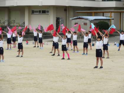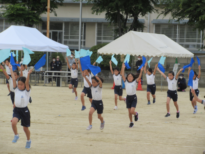 青、水色、赤、ピンクの4色フラッグを使って、悠然と踊る4年生、チアダンスをイメージしてフラッグの持ち方や腕の伸ばし方、何回も練習したんだろうなと感動しました!「諦めないでどんなときも」と動きも心もひとつにできた4年生、感動しました!
