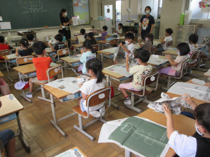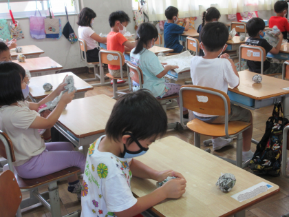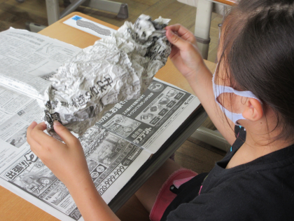 とっても楽しそうです。しんぶんしをやわらかくしている手つきがとってもていねいです。完成したら校長先生にも見せてくれるそうです。楽しみです!