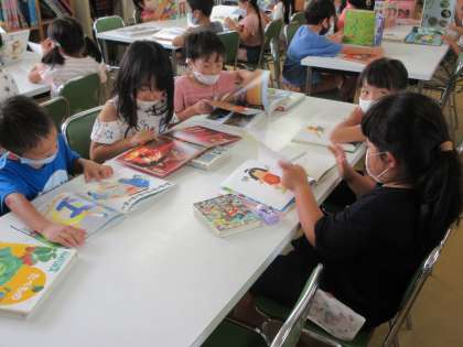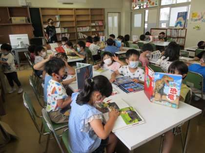 図書室で読書タイムです。運動会(体育参観)が終わって、改めて1年生の様子を見ると、なんだかたくましくなったような気がしました。
