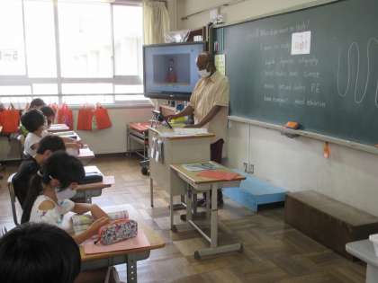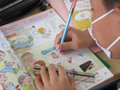 高学年は、外国語科の学習です。聞き取った内容をふまえて解答しています。