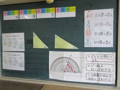 子どもたちが学びを振り返られるよう、少人数教室ではポイントを後ろに掲示しています。4年生の少人数担当の先生が、いろいろと学びのアシストをしています!