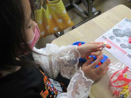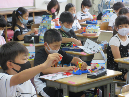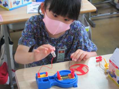 理科「直列つなぎ」と「並列つなぎ」の学習です。豆電球をセットする前はプロペラを付けていましたので、豆電球に明かりがつくと「わ〜、ついた!」と声があがり、さらにつなぎ方をかえたことで豆電球の明るさが違うことがわかり、「さっきより明るい〜!」の声があがりました。