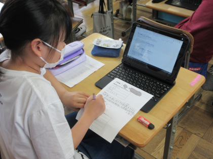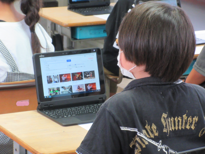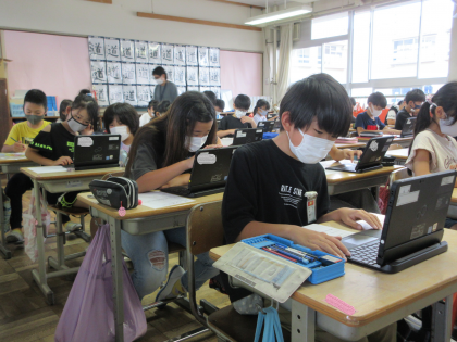 音楽の学習です。音楽室では楽器のテストを実施中です。教室では、弦楽器について調べています。また、モーツァルトについても調べています。小さい「ァ」を入力することに苦戦したようです。