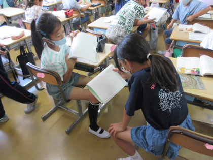 国語「一つの花」です。めあては「題名にこめられた思いを考えることができる」です。4年生でも個人思考のあと、近くの人と話し合いです。ただ、聞く話すではなく、話し合いをすることで自分の考えが進化することをめざしています。