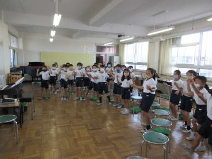 音楽室の雰囲気がいっきに変わりました。「リズムチャレンジ」になると、子どもたちはリズムに合わせてノリノリ!校長先生はびっくりしました。かっこいい曲で思わず踊りそうになりました。
