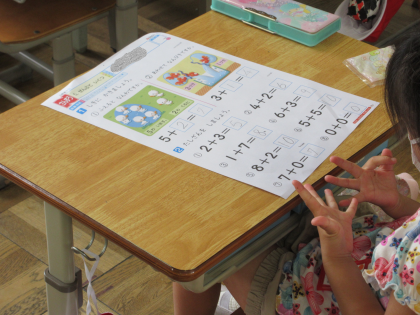 算数のテスト中でした。 指で数えて、一問一問見直しをしています。1年生ながら緊張感がありました。