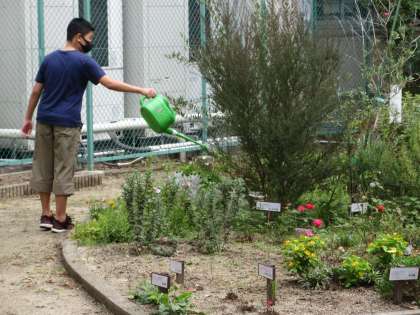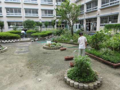 長休時、中庭の様子です。環境委員会のメンバーが水やりをしています。
